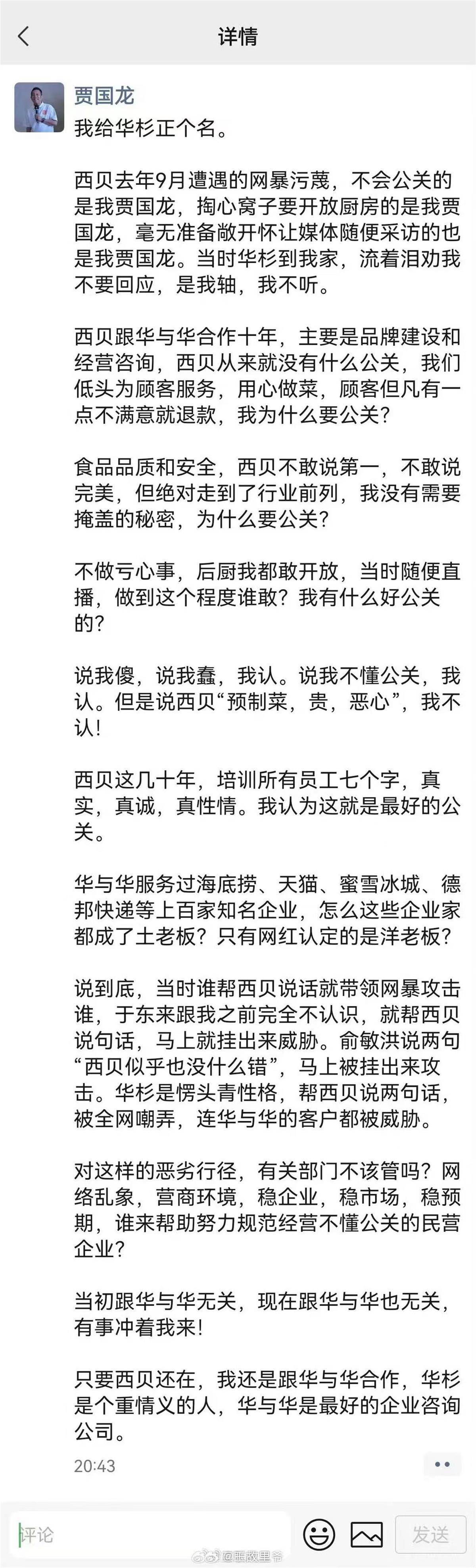 他同时提及,当时帮西贝发声的于东来、俞敏洪等均被网暴,华杉也因声援被嘲讽、客户受威胁。贾国龙呼吁有关部门整治网络乱象,并表态将继续与华与华合作,称其是“最好的企业咨询公司”。
